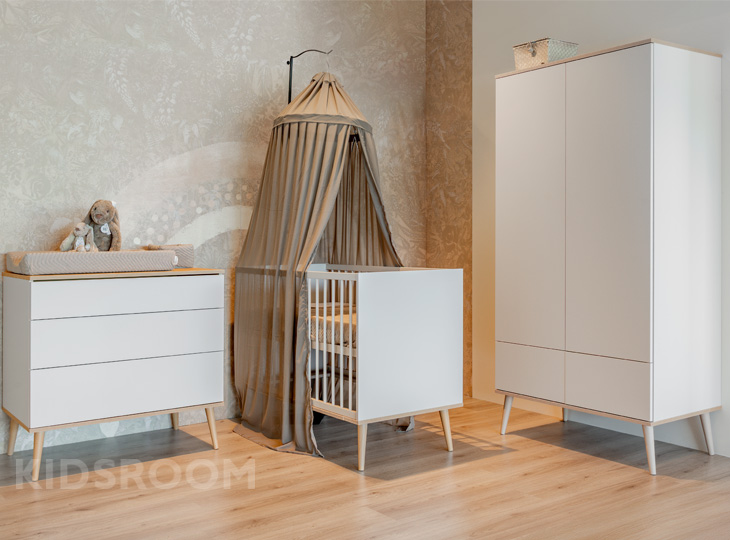 De Quax Flow 3-delige babykamer in de kleur clay & oak heeft een prachtige uitstraling. De egale lak combineert met hout fineer staat zeer luxe. De set bestaat uit een ledikant (60×120), commode en kledingkast. Zo kan je baby slapen, kun je verschonen en heb je meer dan genoeg opbergruimte. Wil je nog meer opbergruimte? Dan kun je ook de 2-delige kamer samen met de XL flow kledingkast bestellen.