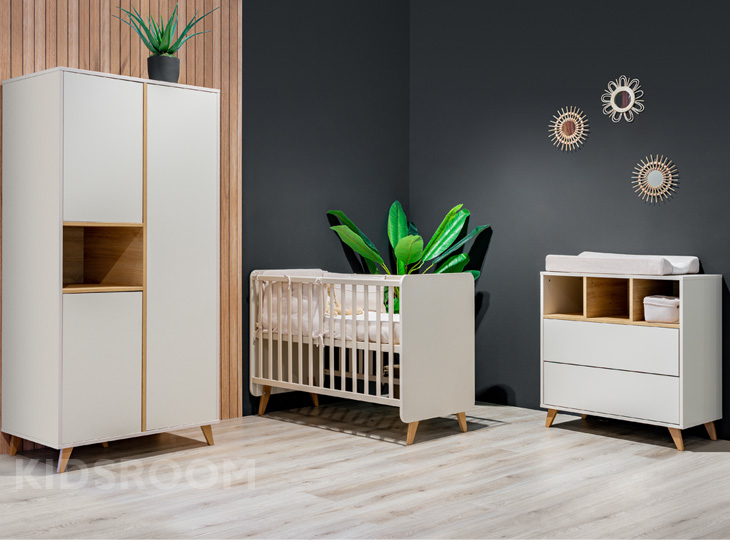 De Loft clay 3-delige babykamer van Quax, bestaande uit een bed 60x120 cm en een commode met 2 laden en 3 opbergvakken en een 3-Deurskast met drie vaste leggers, drie mobiele leggers en twee kledingroedes . De combinatie van strakke vormgeving, gebruikte warme kleuren en schuine beukenhouten pootjes geven deze babykamer van Quax een eigentijdse uitstraling. Deze kamer is ook leverbaar in wit en Honey Ash.