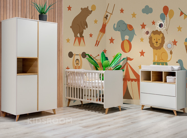 De Loft clay 3-delige babykamer van Quax, bestaande uit een bed 60x120 cm en een commode met 2 laden en 3 opbergvakken en een 3-Deurskast met drie vaste leggers, drie mobiele leggers en twee kledingroedes . De combinatie van strakke vormgeving, gebruikte warme kleuren en schuine beukenhouten pootjes geven deze babykamer van Quax een eigentijdse uitstraling. Deze kamer is ook leverbaar in wit en Honey Ash.