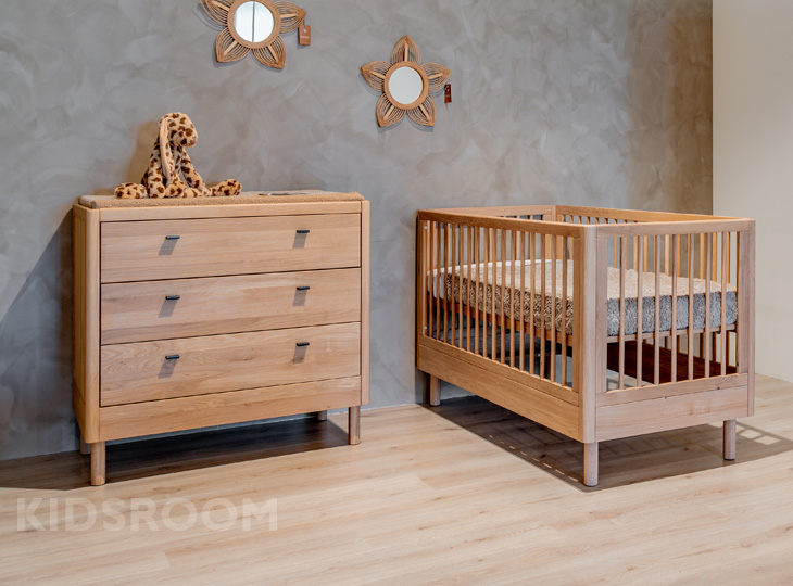 2-Delige babykamer Forrest massief eiken van Vipack. De collectie Forrest is ontworpen met oog voor detail en straalt kwaliteit uit op elk niveau. De meubelen zijn gemaakt van hoogwaardig massief eikenhout. De commode biedt voldoende ruimte om alle benodigdheden bij het verschonen van je baby binnen handbereik te houden en heerlijk wegdromen doe je in het ledikantje 70x140 dat met je meegroeit.