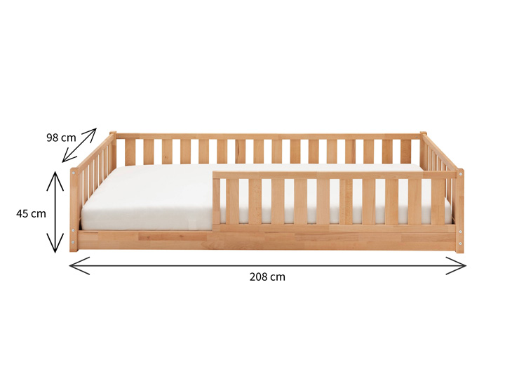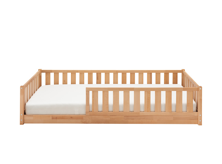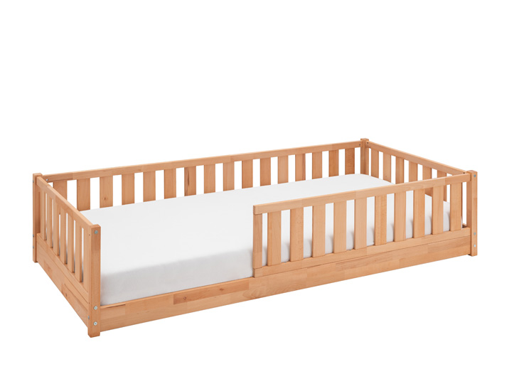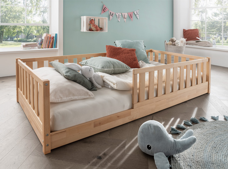 Het Fenna bodembed (ook wel vloerbed of Montessori-bed) is de ideale keuze voor peuters en jonge kinderen. Dankzij de balustrades slaapt je kleintje veilig zonder uit bed te rollen, terwijl de lage instap het mogelijk maakt om zelfstandig in en uit bed te stappen.