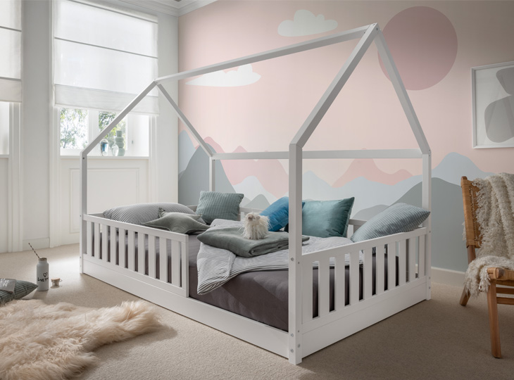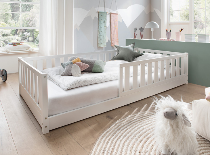 Het Fenna bodembed (ook wel vloerbed of Montessori-bed) is de ideale keuze voor peuters en jonge kinderen. Dankzij de balustrades slaapt je kleintje veilig zonder uit bed te rollen, terwijl de lage instap het mogelijk maakt om zelfstandig in en uit bed te stappen.