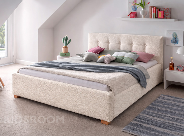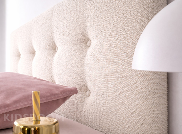 Binnenkort heerlijk wegdromen in stijl? Dan is bedframe Lima precies wat je zoekt. Dit sfeervolle, gestoffeerde bed is speciaal ontworpen voor kinderen en tieners en combineert comfort met een trendy uitstraling. Het hoge hoofdbord met grote, ronde knopen geeft het bed een speels én luxe karakter, terwijl het bijpassende voetenbord zorgt voor een geborgen gevoel. Dankzij het tijdloze design past Lima moeiteloos in zowel een kinderkamer als een tienerkamer en sluit het perfect aan bij de nieuwste interieurtrends.