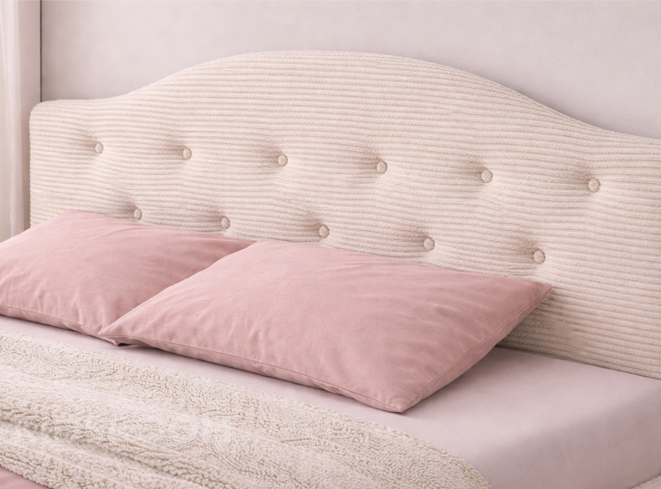 Dit prachtig gestoffeerde ledikant is afgewerkt met een sierlijk gecapitonneerd hoofdbord. De zachte, ronde vormen geven het bed een speelse en verfijnde uitstraling,  perfect voor een sfeervolle meisjeskamer. Maak het geheel compleet met een matras en lattenbodem die aansluiten op jouw persoonlijke slaapwensen, en geniet elke nacht van ultiem comfort in een dromerige setting.