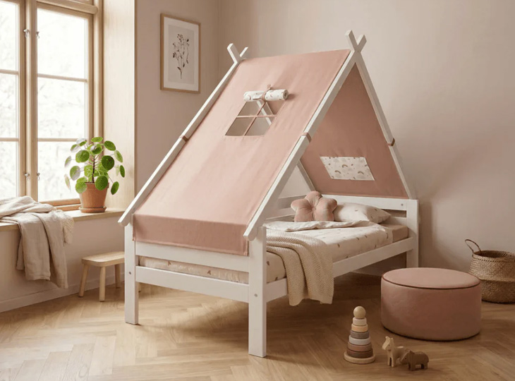 Het bed is voorzien van een Tipi Frame dat zorgt voor een gezellige, geborgen sfeer. Deze vorm prikkelt de verbeelding en maakt van het bed een eigen plekje. Combineer het frame met een textielset zoals: Surf, Rainbow, Over the Moon of Jungle Book, passend bij elke stijl en persoonlijkheid.