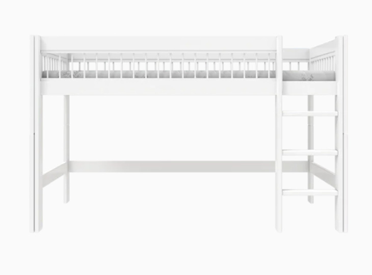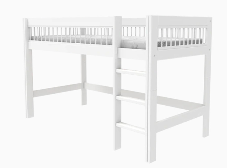 Door de hoogte ontstaat er extra ruimte onder het bed voor een speelhoek of opbergruimte. Gemaakt van stevig Scandinavisch hout, veilig dankzij trappen en relingen, en eenvoudig uit te breiden met accessoires voor een persoonlijke uitstraling.