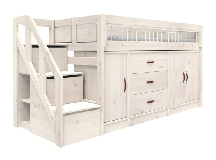 Dit unieke bed, verkrijgbaar in whitewash en wit, maakt optimaal gebruik van de ruimte onder het bed. Het All-in-one systeem is een flexibel opbergsysteem met ingebouwde oplossingen, waarbij verschillende modules naar wens gecombineerd kunnen worden. Onder het bed zijn All-in-one opbergmodules geplaatst en aan de voorkant vind je de meest praktische opbergmogelijkheden.