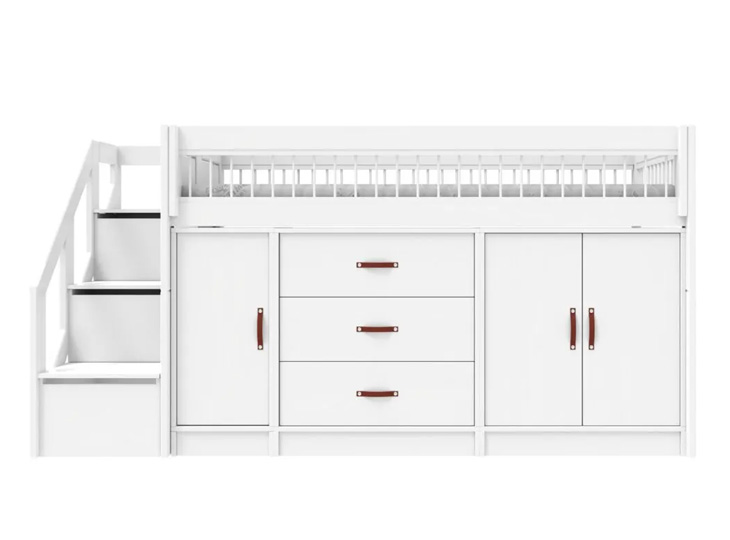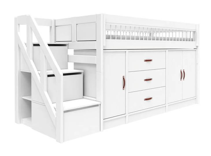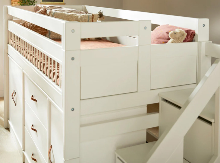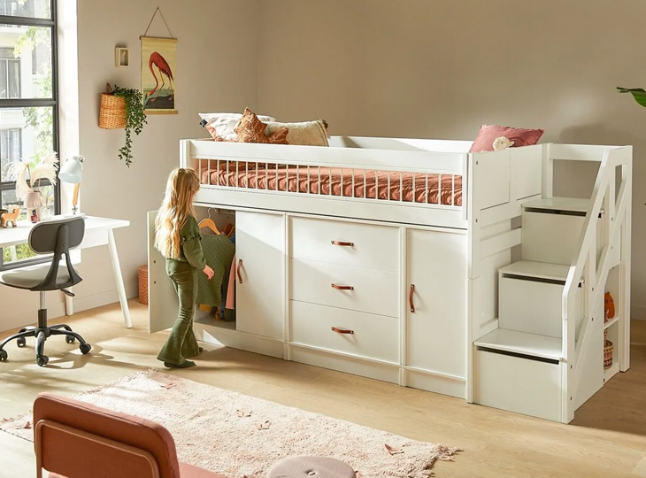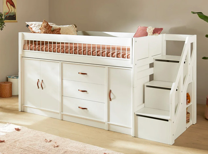 Zo is een extra kledingkast overbodig en kan uw kind gemakkelijk zelf bij zijn of haar spullen, aangezien alle opbergmodules op kindvriendelijke hoogte zijn geplaatst. Dankzij de hoofdborden aan beide zijden kan uw kind veilig hoog slapen.