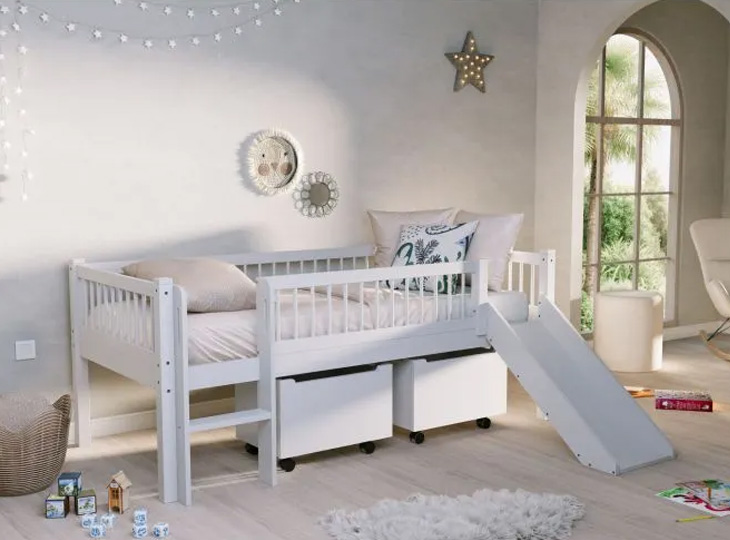 Kies voor de bijpassende set van 2 lades op wielen, ideaal om speelgoed, boeken of beddengoed netjes in op te bergen. Dankzij het praktische ontwerp schuiven de lades eenvoudig onder het bed, waardoor de kinderkamer altijd opgeruimd blijft.