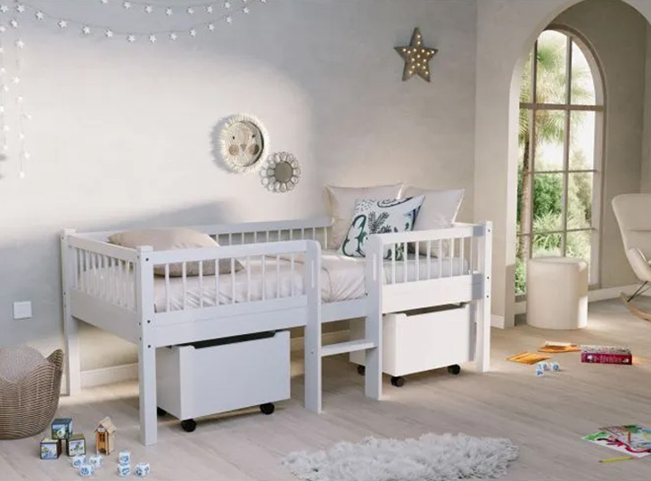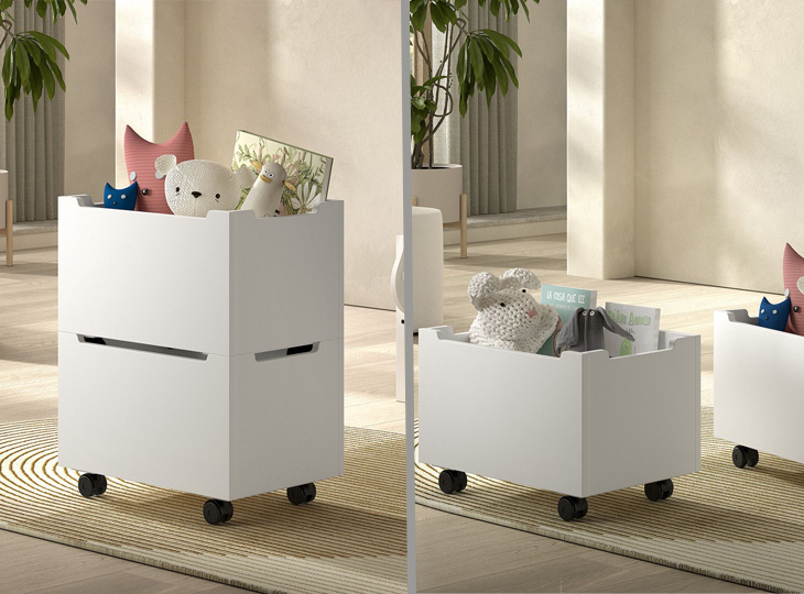 Kies voor de bijpassende set van 2 lades op wielen, ideaal om speelgoed, boeken of beddengoed netjes in op te bergen. Dankzij het praktische ontwerp schuiven de lades eenvoudig onder het bed, waardoor de kinderkamer altijd opgeruimd blijft.