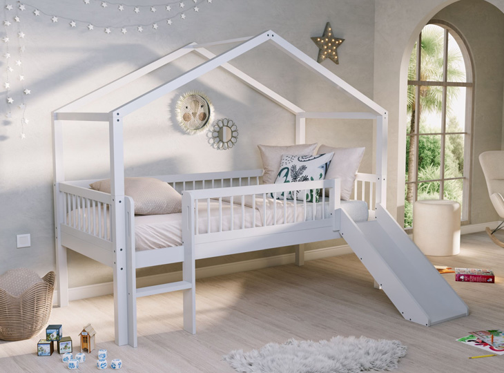 Het Forrest beech midi huisbed is vervaardigd uit hoogwaardige Europese beukenhout wit afgelakt en combineert kwaliteit met een speels en tijdloos ontwerp. Dankzij de verhoogde constructie is er plaats voor een ladder, en blijft er onder het bed voldoende ruimte voor opberging. De glijbaan maakt het extra leuk om in dit bed te spelen! Voor extra veiligheid is de midislaper rondom voorzien van hekjes als uitvalbeveiliging. Het dak is eenvoudig afneembaar, waardoor het bed moeiteloos kan worden omgetoverd tot een kajuitbed. Met kleurrijke kussens, dekentjes en een lichtslinger creëer je een knusse en persoonlijke sfeer.
