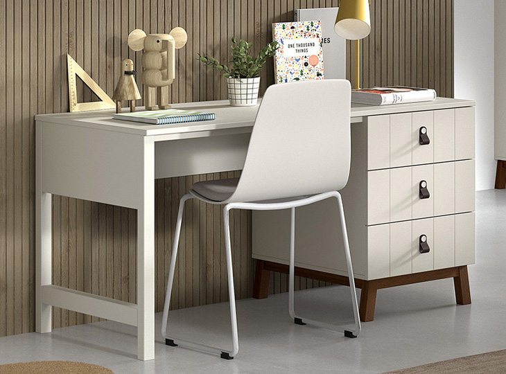 Het bureau uit de Sezane collectie biedt een royaal werkoppervlak, ideaal voor schoolwerk of creatieve projecten. Drie praktische lades zorgen voor voldoende opbergruimte voor schoolspullen en persoonlijke items. De combinatie van warme walnootaccenten en zachte kleitint geeft de kamer een frisse, eigentijdse uitstraling die zowel kinderen als jongeren aanspreekt. De stijlvolle leren handgrepen maken het geheel helemaal af.