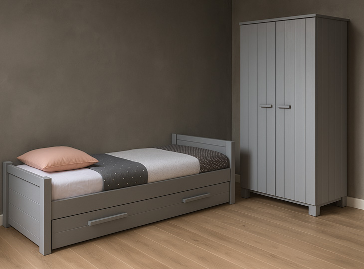 Deze Woood kinderkamer Dennis is gemaakt van geborsteld hout in de kleur beton grijs. De nerven en noesten worden door het borstelen geaccentueerd waardoor het hout van de Dennis kinderkamer een doorleefde uitstraling krijgt. Door deze bewerking kunnen oneffenheden, kleine scheurtjes en noesten extra zichtbaar zijn op de Dennis kinderkamer van Woood. Dit zijn kenmerken van het doorleefde hout. Ieder exemplaar is hierdoor uniek!