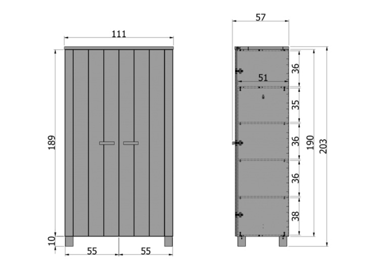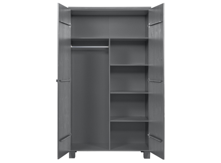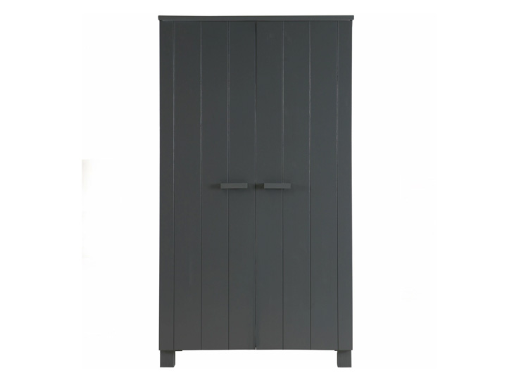Deze Woood 2-deurs kledingkast Dennis Steel Grey past perfect in een moderne slaapkamer. Deze houten kast op pootjes is gelakt in een grijze kleur, heeft een geborstelde afwerking en de deuren hebben een verticale v-groef belijning. De kinderkast heeft een legplank over de breedte van de kast, het linker deel van de kast is een hanggedeelte en het leggedeelte met 5 legplanken zit rechts. Genoeg ruimte om al je kleren op te bergen. Alle delen van de kast die je ziet, zijn gemaakt van gelakt grenen. De legplanken en de achterkant bestaan uit spaanplaat. De nerven en noesten in het hout blijven zichtbaar wat de kast een extra robuust karakter geeft en is ieder exemplaar uniek.