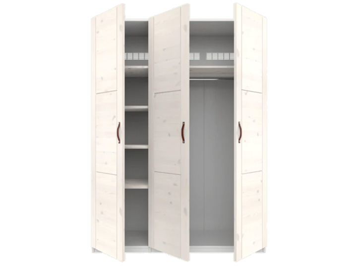De 3-deurs kledingkast van Lifetime Kidsrooms is op maat gemaakt naar de wensen van uw kind en wordt geleverd met een hangroede en 5 legplanken voor voldoende ruimte om kleding op te hangen of te leggen. De 3-deurs kledingkast is ontworpen met eenvoud en functionaliteit in gedachten, daarom zal de kledingkast nog vele jaren in elke kinderkamer passen. Er zit een ventilatiekanaal achter de kledingkast, zodat de inhoud van de kledingkast geventileerd wordt. Wilt u de kast een mooie upgrade geven? Kijk dan ook eens naar de kledingroede met led verlichting.
