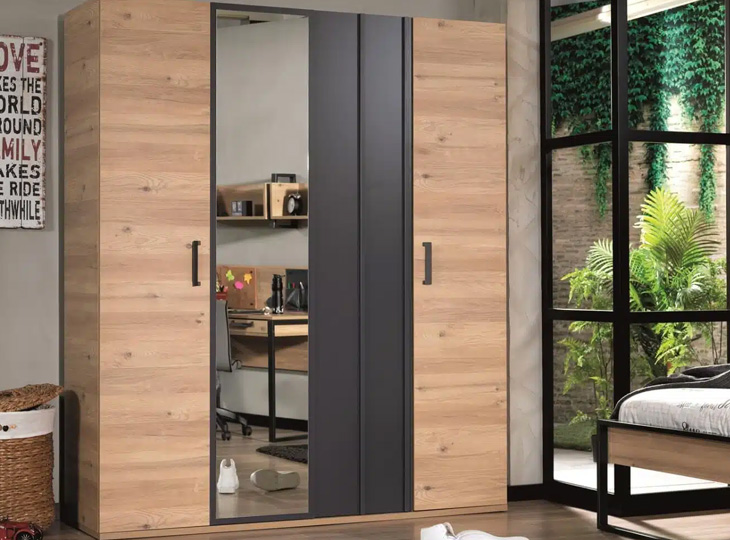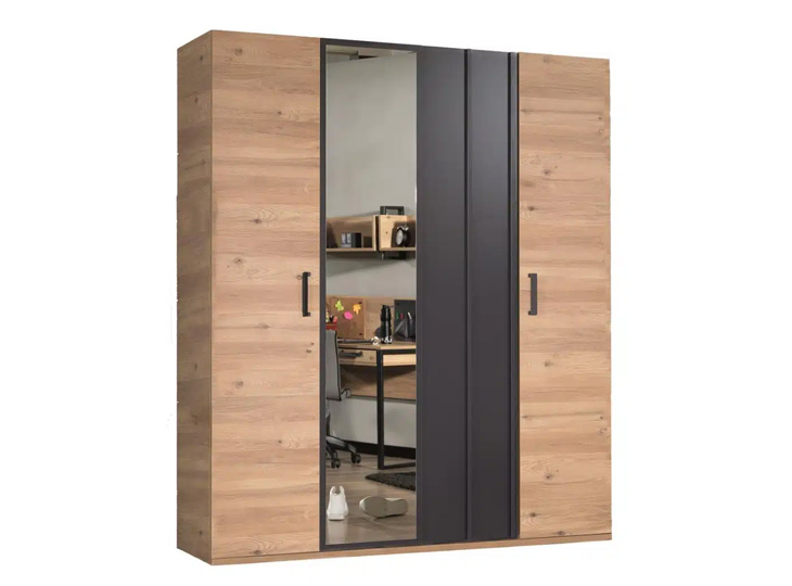 De Irony 4-deurs Kledingkast combineert robuuste materialen met een stoere industriële uitstraling. Deze kledingkast is ontworpen om zowel functioneel als stijlvol te zijn, met veel opbergruimte voor al je kleding en accessoires. Gemaakt van hoogwaardige meubelspaanplaat in een blankeikenkleur met antracietkleurige details. De Irony 4-deurs Kledingkast biedt een overvloed aan opbergruimte, ideaal voor het netjes opbergen van zowel hangende als gevouwen kleding. De combinatie van planken en kledingroedes zorgt voor een georganiseerde en overzichtelijke kast. Het robuuste ontwerp en de industriële look maken deze kast tot een echte eyecatcher in elke slaapkamer.
