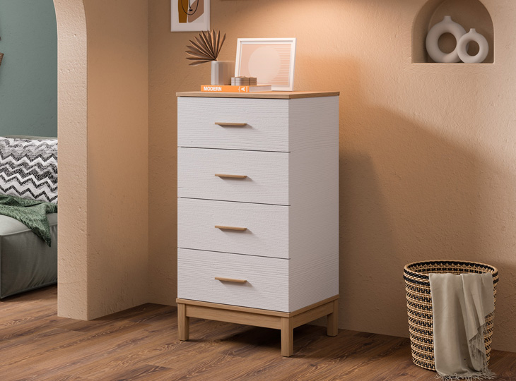 Je creëert gemakkelijk extra opbergruimte met deze hoge ladekast. De kast beschikt over vier ruime lades die stil en soepel openen en sluiten. Zo berg je moeiteloos al je kleding, accessoires, documenten en andere spullen netjes en georganiseerd op.