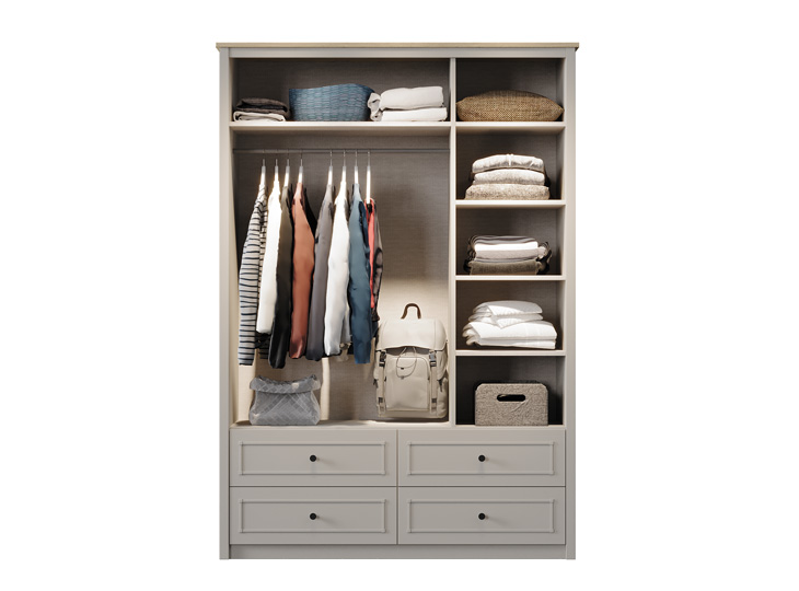 Aan de linkerkant bevindt zich een grote legplank en een kledingroede, ideaal voor het ophangen van lange kleding. Aan de rechterkant zijn vier smalle legplanken perfect voor het opbergen van gevouwen kleding, accessoires of schoenen. De vier ruime lades aan de onderkant bieden extra opbergruimte voor kleinere items. De spiegel in het midden van de kast voegt niet alleen stijl toe, maar is ook handig voor het controleren van je outfit.