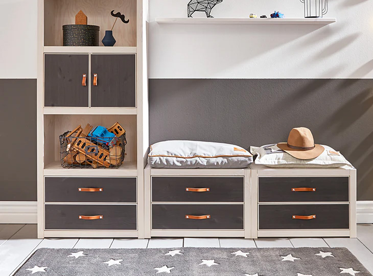 Deze boekenkast voor de kinderkamer kan worden gecombineerd met verschillende onderdelen van