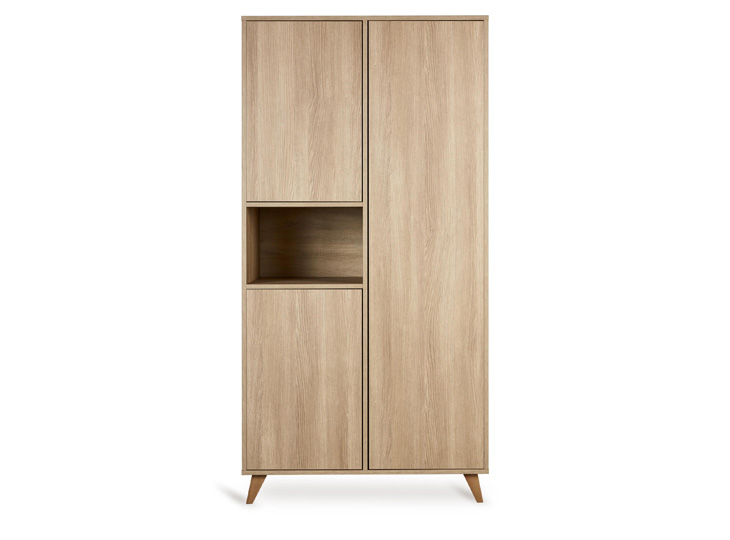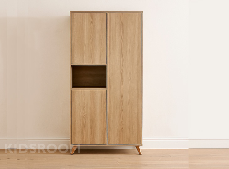 Drie greeploze draaideuren met druksysteem verbergen een overvloed aan opbergruimte, inclusief hangroedes en verstelbare planken voor al je baby- of kinderspullen. Het open vak (45 x 30 x 56 cm) is perfect voor decoratie of handige opbergers.