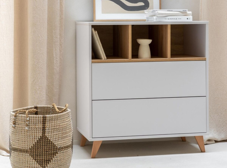 De Loft Commode combineert elegantie met praktische opbergruimte. Met twee greeploze lades met pushsysteem, drie opbergvakken en vier massieve beukenpootjes houdt hij alles netjes en bereikbaar.