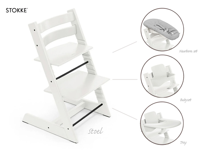 Met de Tripp Trapp® stoel inclusief Newborn Set, Baby Set² en Stokke® tafelblad zit je kind vanaf de geboorte tot in de peuterjaren veilig en comfortabel aan tafel. De verstelbare stoel groeit mee met je kind en biedt ergonomische ondersteuning in elke fase. De Newborn Set is geschikt tot 9 kg en voorzien van een vijfpunts veiligheidstuigje. Zodra je kind zelfstandig kan zitten (vanaf ca. 6 maanden), zorgen de Baby Set² en het tafelblad voor een stabiele, kliedervrije eet- en speelplek. Alles in één doos, voor extra gemak en meer voordeel.