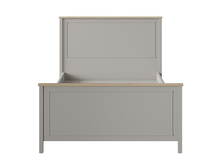 De meubels zijn uitgevoerd in een moderne grijze kleur die elegantie en rust uitstraalt, gecombineerd met warme eikenkleurige details die een natuurlijke sfeer creëren in de kamer.