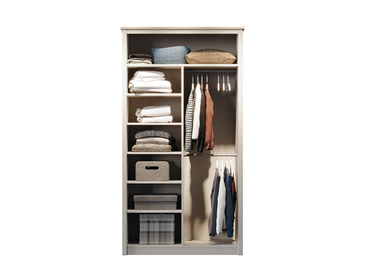 De 2-deurs kledingkast biedt volop opbergruimte met een doordachte indeling: vijf legplanken aan de linkerkant en twee kledingroedes aan de rechterkant – ideaal voor kleding, accessoires en linnengoed. Gemaakt van hoogwaardig spaanplaat en ontworpen voor dagelijks gebruik.
