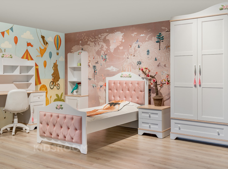 Kinder-/tienerkamer Bianca, in deze geweldige 3-delige set! Het Twinbed (120x200) uit de serie Bianca is voorzien van een Roze gestoffeerd hoofd- en voetbord. Het landelijke witte design wordt extra bijzonder door de prachtige bloemen die zijn afgebeeld op het hoofd- en voetbord. De ruime 3-Deurskast heeft achter de linker- en middendeur 2 legplanken en 2 kledingroedes. Achter de rechterdeur 5 legplanken. Hierdoor dus genoeg opbergruimte voor al jouw kleding! De kledingroede is voorzien van sfeervolle LED-verlichting. Het nachtkastje maakt de kamer helemaal af, deze is voorzien van 2 lades waarin alle spulletjes kunnen worden opgeborgen.