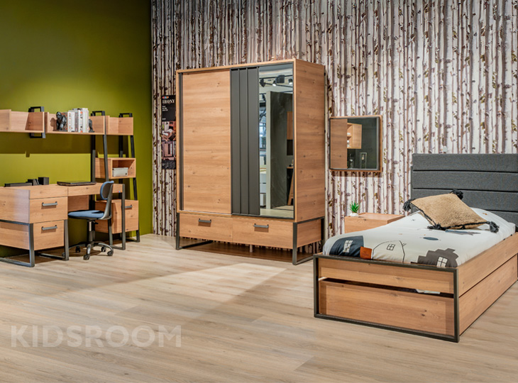 Robuust tienerkamer Irony in een stoere industriële look. Het stoere materiaalgebruik en de eigentijdse vormen, geven deze Irony tienerkamer een moderne uitstraling. Irony is gemaakt van melamine houtvezelplaat in blank eikenkleur gecombineerd met antraciet gelakt metaal. Met een comfortabel bed   gestoffeerd in antracietgrijze denim en een 3-Deurskast met genoeg opbergruimte! Meer van de Irony collectie: